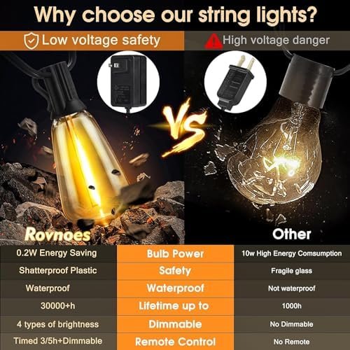 💡【Low Voltage More Safety & Energy Saving】150ft Extra-long led string lights outdoor are equipped with Rovnoes upgrade heavy-duty wires and 58 shatterproof vintage plastic edison bulbs (2 spares), which can be connected up to 2 strands easily. (Environment friendly) last up to 30,000 hours life span, equals up to 6 years of daily use(12H). With advanced LED bulbs are super energy-saving 0.2w/per bulb, reducing your electricity bill by up to 90% compared to traditional incandescent bulbs.
