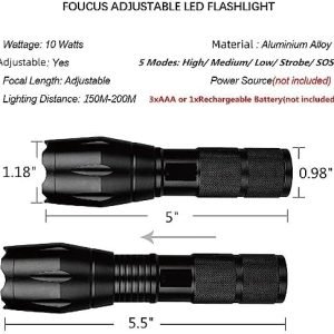 Adjustable Focus – Adjustable focus for use in different situations (just rotate the flashlight head to adjust). The LED flashlight allows you to select focus between spot and flood beams.