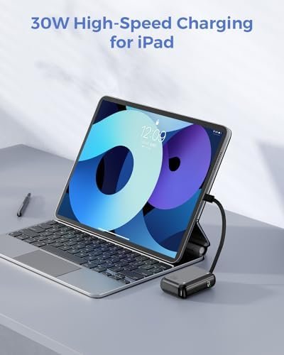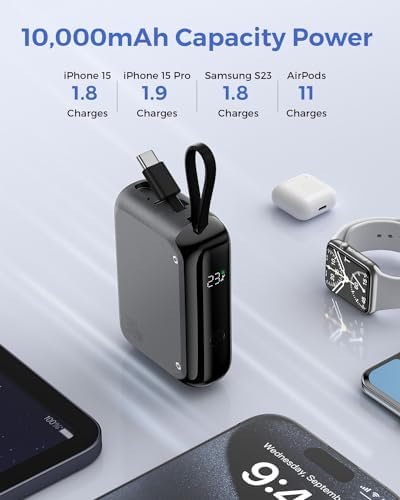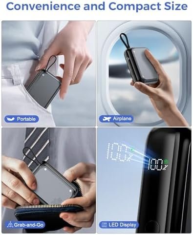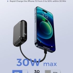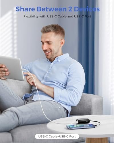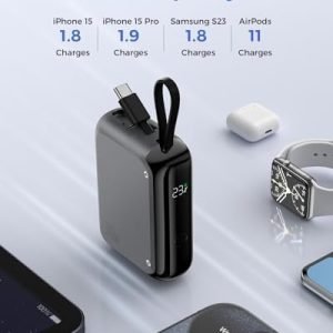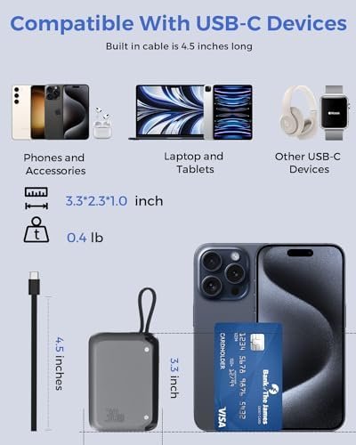 Bi-Directional Charging: Charge your devices and the power bank simultaneously with the built-in 15cm USB-C cable and additional USB-C port
