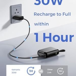 What’s Included: 1x 4smarts Power Bank 10000mAh; 1x Built-in 30W USB-C Cable; 1x USB-C-to-A Converter; 1x Instruction Manual; 1x Welcome Guide