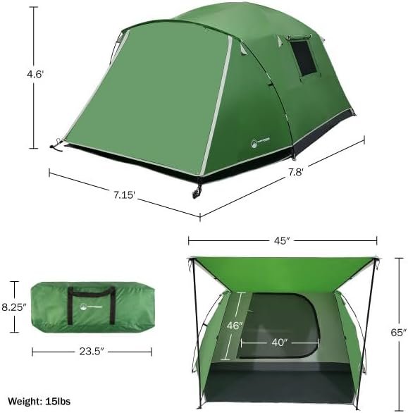PRODUCT DETAILS – Materials: 600MM Poly Taffeta, 68D Poly Mesh, Polyethylene, and Fiberglass. Dimensions: (L) 7.8’ x (W) 7.15’ x (H) 4.6’; Door: (L) 40” x (W) 46”; Packed: (L) 23.5” (W) 7.5”; Canopy: (L) 65” x (W) 45”; Center: (H) 57”; Weight: 15lbs. Color: Green.