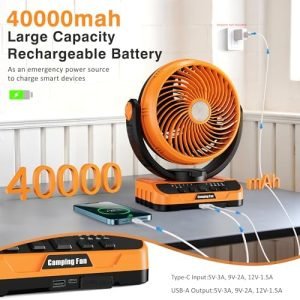 Equipped with a built-in 40,000mAh rechargeable battery, this fan boasts an impressive operational range of 10 to 136 hours on a single full charge, achievable after 10-12 hours of charging. It features a convenient battery indicator light, ensuring you’re always aware of the remaining power. This battery-powered fan is designed with both type-C input and USB-A output ports, making it not only a source of cooling but also a versatile emergency power bank. You can rely on it to charge various devices, from mobile phones to laptops, making it an indispensable tool for outdoor camping or during power outages caused by natural disasters like hurricanes.