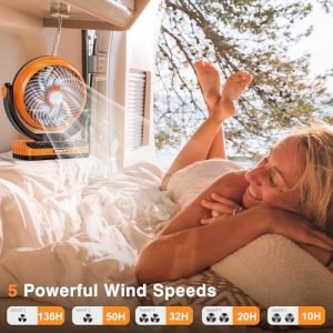 This camping fan features a brushless motor and a centralized air outlet, a design commonly seen in circulation fans. This structural design produces a strong and concentrated airflow while also achieving a moderate diffusion of air. The result is a wider coverage area, ensuring a more even cooling effect throughout the entire camping area or any outdoor environment. With 5 adjustable speed settings, the battery powered fan can reach speeds of up to 16.4ft/s, allowing you to customize the breeze to your comfort level.On a fully charged battery, the fan offers an exceptionally wide range of runtime, from 10 to 136 hours, depending on the speed setting selected.