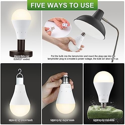 【MULTIPLE WAYS TO USE】Emergency light bulb has a variety of ways to use, not only can work as a normal light bulb, screwed into the E26/E27 lamp base, you can light up your home, or use the hook switch can be used as a flashlight, camping lights, warehouse lights.