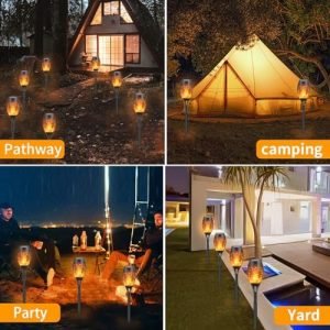 Flickering Flames Torch Lights:FAISHILAN small solar outdoor torch lights cast a lovely warm glow like flickering flame,as a safe alternative to the real “flames”.Solar outdoor lights flicker a soft and mod-enhancing “Real” flame for outdoor decorations for patio, garden, yard, porch, pool decor and for party, camping, barbecue, wedding, christmas, halloween decor.