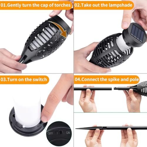 Easy Installation:Setting up FAISHILAN torch lights is simple. These solar lights for outdoors are easy to install without needing any tools or wires. Just assemble the parts and place the stake into the ground in an area with direct sunlight. Please remember to switch on the light before using it for the first time. Afterward, the outdoor solar lights will automatically illuminate from dusk until dawn.