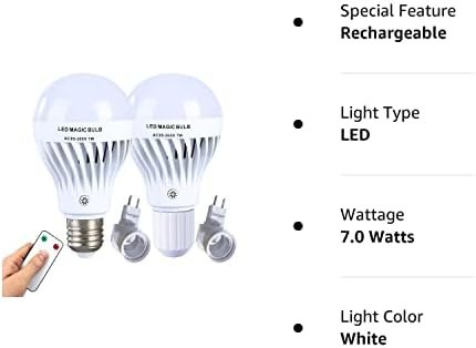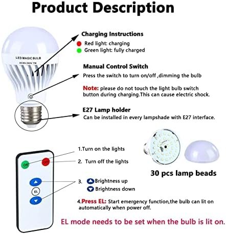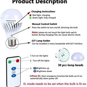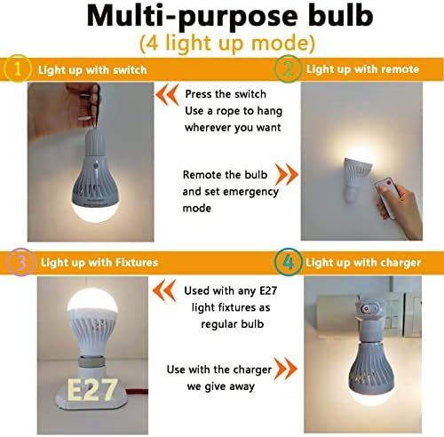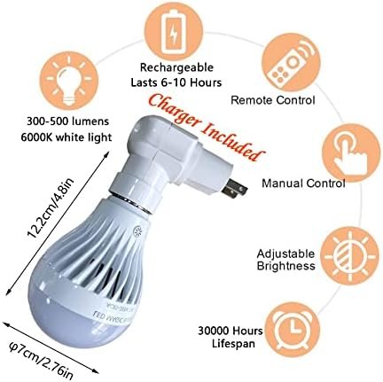 【Rechargeable light bulb with remote control】-The light bulb is battery powered light bulb, built-in rechargeable lithium battery. The battery backup light bulb can last for 10 hours after being fully charged. You can use the remote control to turn on/off or dimming up/down the light bulb within 16FT.
