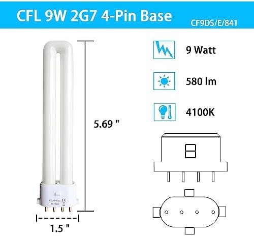 T4 9 Watt CFL Light Bulb,4100K,4 pins 2G7 Base,Length:5.69 inches,Width:1.5 inches – 2 Pack.