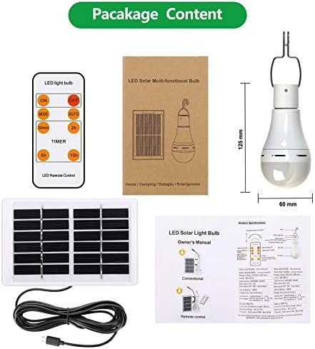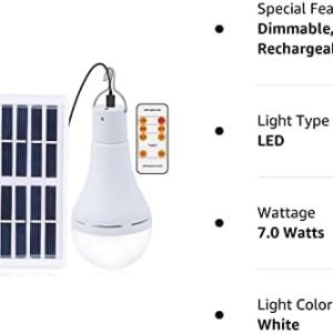 【What You Get】You will get hight quality Afoskce solar light bulb which certified by FCC, CE, ROHS; 1-Year Warranty; 7W Rechargable Solar Light Bulb with Hook * 1; 1.2W Solar Panel with 3 Meter Cord * 1; Remote Control *1; English User Manual *1; Note: The solar light can be used in any weather, but the bulbs are not waterproof.
