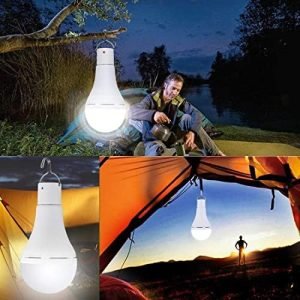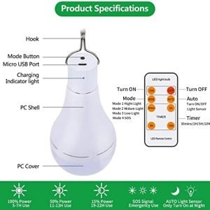 20 LEDs Hight Light Solar Bulb with Remote Timer – Afoskce dimmable led solar bulb with 20LEDS hight brightness and high quality 2835 LED; you can remote setting timing 0.5/2/5/10 hours auto turn OFF the solar camping light.