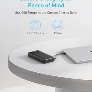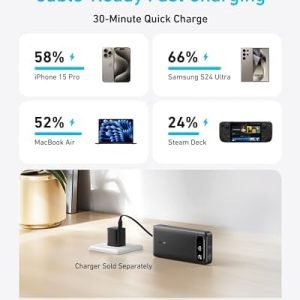 Speedy Cable Charging: Utilize the built-in cable to elevate your iPhone 15 Pro to 58% or a MacBook Air to 52% in 30 minutes. You can also fully recharge this power bank in 1.5 hours with a 65W charger.