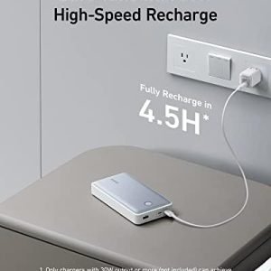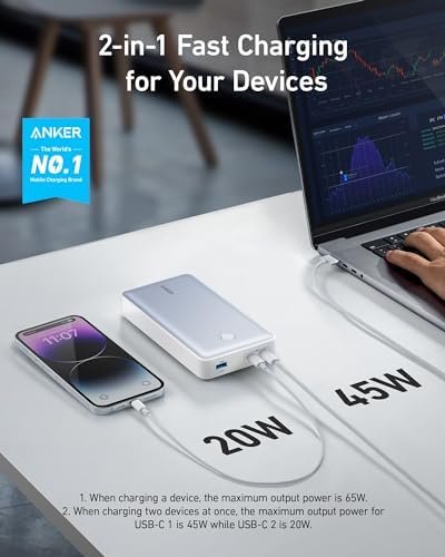 2-in-1 Fast Charging: With a 65W total output and two USB ports, the power bank delivers high-speed charging for 2 power-hungry devices simultaneously. (Note: USB-C 1 has a maximum output of 45W while USB-C 2 has a maximum output of 20W.)