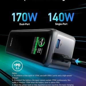 170W Fast USB-C Recharge: Recharge your power bank at lightning speed with the convenience of dual USB-C ports, allowing you to fully replenish it in just 37 minutes. Note: When the power bank is fully depleted (screen inactive), the base charging will automatically shut off. Please recharge via the USB-C port first to restore base charging functionality.