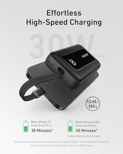 30W Two-Way Fast Charging: Charge quickly with 30W output and recharge just as fast with 20W input, keeping your devices ready in no time. Boost an iPhone 15 from 0 to 57% in just 30 minutes.