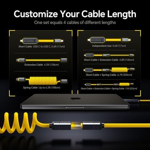 Customize Your Cable Length. This USB C cable set includes 3 cables. ①USB C to USB C Short Cable, 0.6ft. ②Extension Cable, 4.2ft③Spring Cable, up to 6.2ft. Short cable can be used independently or connected to the extension cable or spring cables,owning this set of cables is equivalent to having 4 USB-C cables, everyone can create their own length as needed