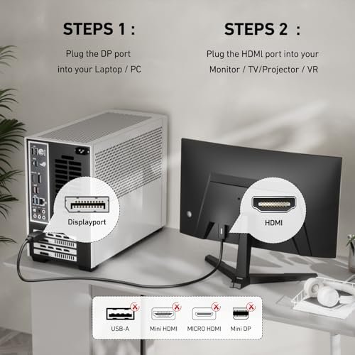 INCREDIBLE PERFORMANCE – The DisplayPort male to HDMI Male converter supports resolutions up to 3840×2160@30Hz, 1920×1080@60Hz(1080p Full HD) including 720p, 1600×1200, 1280×1024 for high definition monitors or projectors, supports flawless audio pass-thru for uncompressed digital 7.1, 5.1 or 2 channels; Gold plated DisplayPort connector resists corrosion and abrasion and improve the signal transmission performance; Molded strain relief increases cable durability