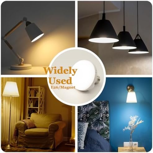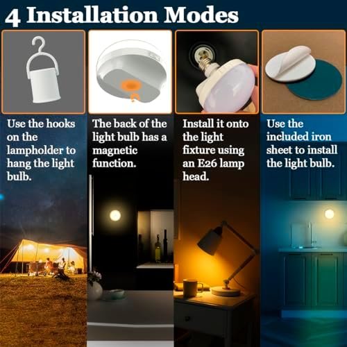 【Built-in Magnet and Easy to Install】LED light has 4 installation ways. ① Easily screw into any kind of light fixture that needs E26 bulb . ②Directly attach to any ironwork surface with the Built-in Magnet.③ Use the metal sheet to stick on any flat surface, using the back of the lamp to adsorbed on the metal sheet, and easily can be removed to use or charge right away.④The use of removable hooks inside the package allows you to hang the light bulb anywhere, making it very suitable for camping.