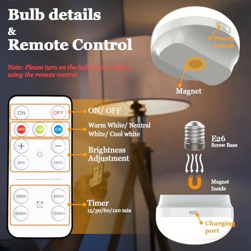 【Built-in 4000mAh Rechargeable Battery】Tips:Do not screw in the E26 socket into an energized socket! Rechargeable Battery Operated Light Bulb is rechargeable battery. Built in 4000mAh battery, No need to purchase additional batteries. All lights need to be charged first before use,Red light is charging state, Green light is full state. Long battery life, it lasts over 30 hours on the Max Brightness and 100 hours in Min settings.