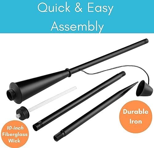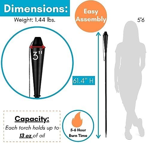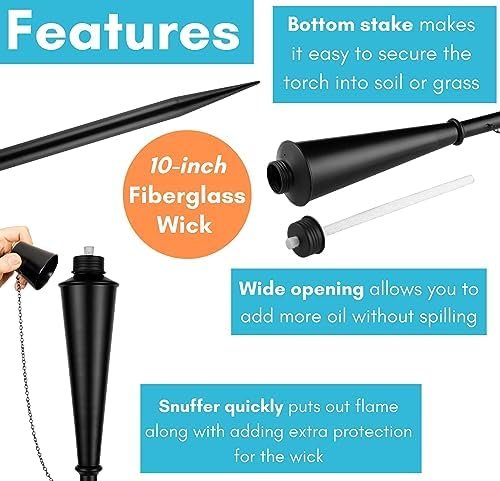 HIGH QUALITY: constructed from with quality iron to giving the torches a durable body. Includes a premium fiberglass wick that provides hours of burn time and updated wide mouth for adding more oil