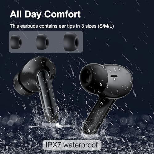 𝐂𝐨𝐦𝐟𝐨𝐫𝐭 𝐅𝐢𝐭 & 𝐄𝐚𝐬𝐲 𝐭𝐨 𝐂𝐚𝐫𝐫𝐲: Each noise cancelling headphones weighs approximately 0.15 ounces for a stable and comfortable fit and comes with 3 different sizes of soft ear tips to fit different ear canals, the small stylish charging case fits easily in your pocket, so you can take it with you. The exterior of the headphones with the mic is covered with a Waterproof coating to protect against sweat and rain during exercise.