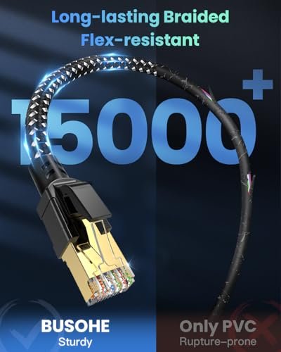 RJ45 Connection and Excellent Interference Resistance: BUSOHE cat8 ethernet cable is using gold-plated RJ45 connectors for excellent conductivity and connectivity. The high speed ethernet cable is made of 4 pairs of shielded twisted pairs(S/FTP) and multiple strands of thick copper wires. With a multi-layer shielding design using shielding foils to minimize signal interference(EMI/RFI) and crosstalk problems