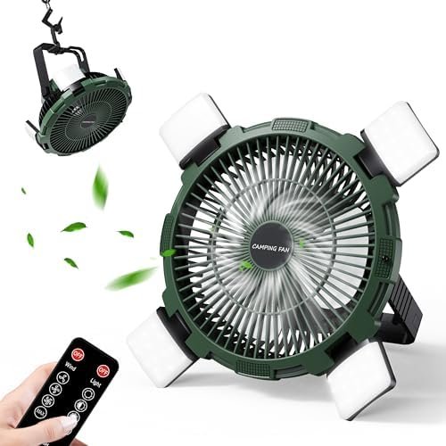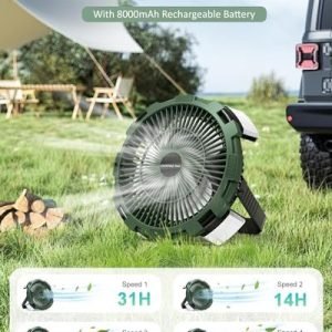 This innovative hook design allows for convenient hanging in various settings, whether inside a tent, under a canopy, or within an RV. Suspending the fan not only offers the dual convenience of overhead cooling and lighting but also preserves valuable space on camping tables or the ground.