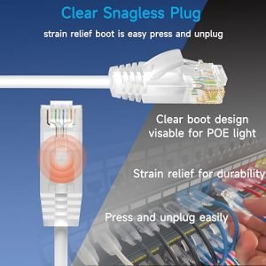 Clear Snagless Plug: Network patch cables are made of clear tap Snagless plug with strain relief boot for maximum durability. Cat6 patch cords with snagless plug is easy press and unplug. Clear boot of slim cat6 patch cable allows to see the light of the POE ports easily.