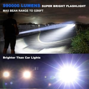The super bright flashlight adopts upgraded LED Chip, 10 times brighter than ordinary beads, the maximum output power is 990,000 lumens, it can easily illuminate objects up to 3280 feet.
