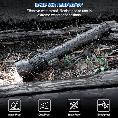 🔦【IPX6 Waterproof】This waterproof emergency flashlight with a tight waterproof design, the waterproof ring at the tail can seal the flashlight, have IPX6 waterproof and anti-slip function, can be used in extreme weather such as rain. However, please do not submerge this hiking flashlight directly into water or discard the dust cover of the charging port as these may directly damage the camping flashlight.