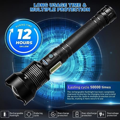 🔦【RECHARGEABLE ΒATTERY & POWER INDICATOR】Rechargeable flashlight uses a large capacity ΒATTERY of 10000 mAh. It can last 8-12 hours on a single charge. The upgraded ΒATTERY has a longer lifespan and can be charged over 50,000 times. while the USB output port allows the flashlights to be used as a backup mobile power source for your phone and other devices. Each blue indicator represents 25% of the energy, you can easy to know the status of the ΒATTERY.