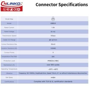 M24 USB3.0 Connector Set: This set includes USB 3.0 type A male plug features with 20 inches cable and USB 3.0 female socket. Designed with intuitive plug/unplug mechanism ensures a hassle-free experience while maintaining a secure connection. Protection Level: IP68 (Mated)