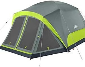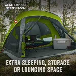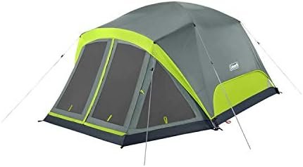 Sets up in under 5 minutes so you spend less time pitching the tent and more time relaxing at the campsite. Enjoy two separate living spaces in one tent with the Coleman Skydome Camping Tent With Screen Room. Features a weatherproof screen room that converts into an additional sleeping area for 1 person, space for extra storage, or more room to lounge. Go ahead and stretch out inside. The nearly vertical walls offer 20% more headroom than a traditional Coleman dome tent. Plus, a wide door design means you can move airbeds, sleeping bags, and other gear in and out with ease. An E-port makes it easy to access an extension cord so you can bring electrical power inside your tent. Downpour in the forecast? This tent features the WeatherTec system with a tub-like floor and patented welded corners, while inverted seams and taped seams on rainfly and tent body help keep water out. Plus, the strong frame has been tested to withstand up to 35 mph winds. This 4-person tent is a great choice for car camping with your crew. These Skydome tents are available in a range of sizes: 4-person, 6-person, and 8-person.