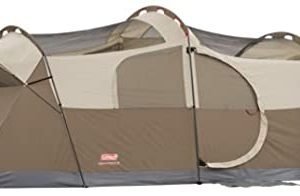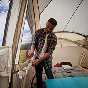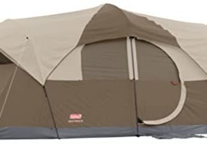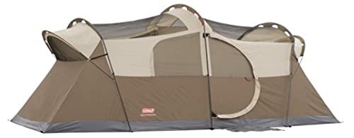 With enough room to fit 10 people or 3 queen size air beds, the Coleman WeatherMaster 10-Person Outdoor Tent lets you easily set up a home base with ample sleeping space. This camping tent is tall enough to stand in comfortably and has a hinged front door for easy entry and room divider for extra privacy. Guaranteed to keep you dry, the WeatherTec system features a tub floor with patented corner welds, protected seams, and a covered zipper that help keep water out. Setup is simple and takes only 20 minutes thanks to snag-free continuous pole sleeves, a patented pin-and-ring system, and snag-free Insta-Clip suspension. The strong frame is tested to withstand 35+ MPH winds, while the durable Polyguard fabric is designed to stand up to the elements for reliable use season after season. Angled windows let in air but not the rain. Integrated pockets make it easy to store and keep track of small items, and the included carry bag offers easy portability and storage.