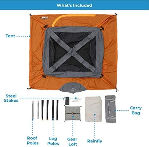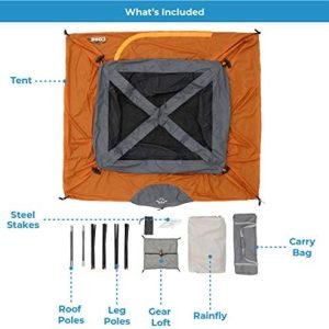 WHAT’S IN THE BAG: Includes tent, rainfly with attached guylines, gear loft, poles, tent stakes, and carry bag.