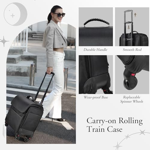 **Conveniently Portable for Travel: Our rolling makeup case is designed with your travel needs in mind. It features a smooth telescopic handle and four 360-degree wheels, allowing for easy mobility. Additionally, an enhanced carry handle on the top of the bag provides alternative carrying options. With its excellent portability, this case is perfect for makeup artists taking jobs or students attending lessons, making it an ideal traveling companion.