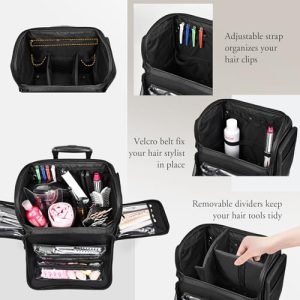 **Flexible and Organized: Our Soft-Sided Rolling Makeup Case offers versatile storage solutions for all your hair styling needs. With dedicated compartments for storing hair styling tools, adjustable dividers to keep your supplies tidy, side pockets for combs and scissors, and two pouches for clips and accessories, this case ensures everything has its place. Additionally, the fixing strap inside keeps your tools securely in place while rolling for added convenience and peace of mind.