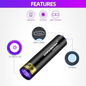 Upgraded Powerful UV 395nm Light Flashlight – Provides 1300mw and 395 nm wavelength UV light with upgraded lamp beads LED.Powerful 395NM UV LIGHT – Make it easier to detect stains.USB-C Charge – More convenient to get fully charged.Equipped with a lanyard- For easy one-handed operation.Multi-Function – Detecting pet dried urine, stains from around all kinds of surfaces in your house; Curing UV reactive adhesive agents; Glow in the dark painting, uranium glass; Gem / Fluorescent identification, etc.