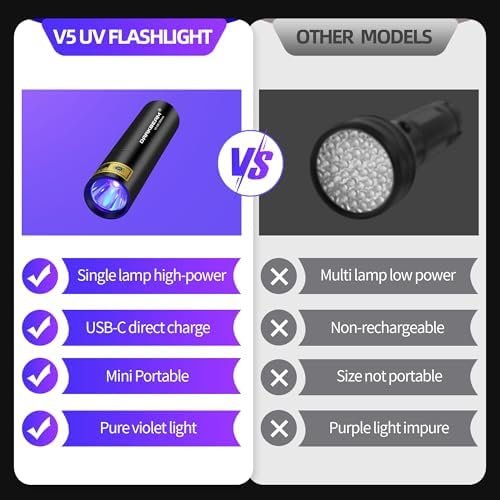 【UPGRADED BRIGHT UV LIGHT BEAD】– Made of upgraded powerful UV LED bead, with high power of 10W and 1300mW radiant intensity (DO NOT ALWAYS LOOK DIRECTLY AT UV LIGHT!). It is more compact than other ordinary UV flashlights, the USB-C direct charging design makes it environmentally friendly and convenient to use. The mini handheld pet dried urine detector also good for curing uv resin and will make your daily life easier!