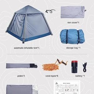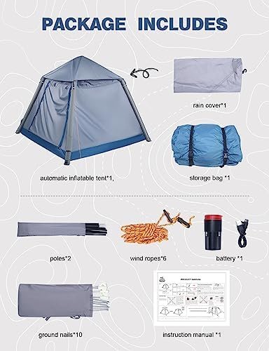 【Package Included】The product includes an automatic inflatable tent, storage bag *1, rain cover*1, poles*2, pole bag*1, ground nail wind rope bag*1, wind ropes*6, ground nails*10, battery *1, instruction manual *1, one-year warranty and lifetime customer service.
