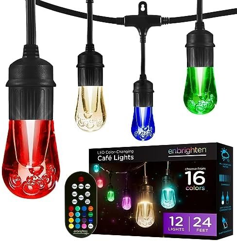 Discover the future of lighting with Enbrighten LED Color-Changing Café Lights. Choose 16 vibrant colors for any special occasion or holiday, create your own custom two-color combinations or choose warm vintage white for beautiful year-round illumination. Each vintage-style bulb features a beautiful acrylic, Edison design. The LED bulbs also boast weather-resistant durability and won’t break if dropped or stepped on — you’ll never have to take down your outdoor holiday lights again! This stylish set includes 12 bulbs on a 24-foot string and is linkable end-to-end with additional strands up to 750 feet. Easily installed on porches, balconies, pergolas, eaves and much more, the bulbs can be hung with hooks, nails or screws. They can also be suspended across a yard or landscape using guide wires for immersive, overhead ambience. The included intuitive remote control lets you manage modes, colors, dimming, timers and more. Trusted fidelity, premium quality, incredible style — experience lighting for life with Enbrighten LED Color-Changing Café LED Lights!