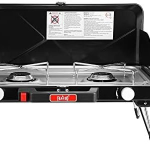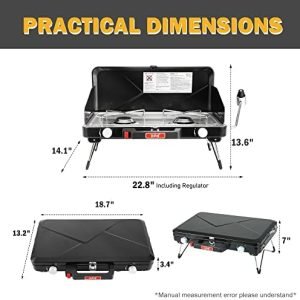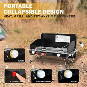 High Output: This camping propane stove featuring 2 burner with 2 x 14000 BTU of cooking power. Total output of 28,000 BTU from two burners. Make delicious food faster.