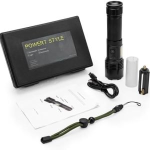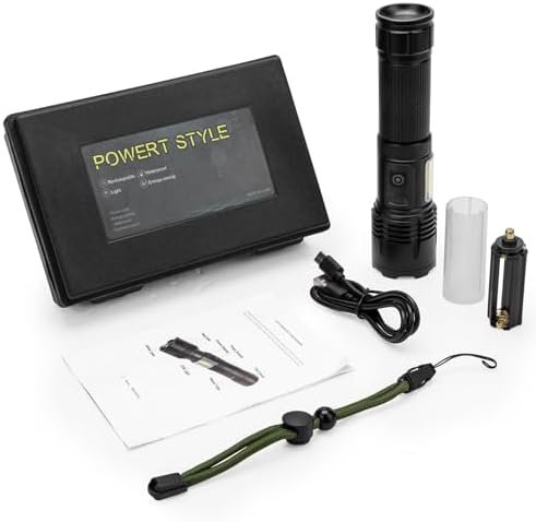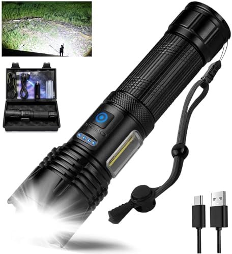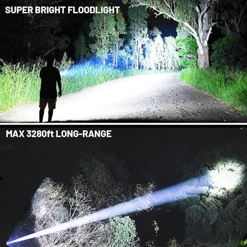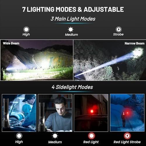 SUPER BRIGHT:The torch is bright up to 900,000 lumens and shines up to 3280ft, easily illuminating a 200 square foot area.LONG-LASTING:12H Super Long Standby with a 5000 ɱAh high capacity bāttery ,but 5 hours quick charging, 30+% more efficient charging.7 MODES:3 main light modes(high, medium, strobe) and 4 sidelights modes (high, medium, red light, red flashing light).ADJUSTABLE:can switch the focused light to view objects at a distance or switch in the wide beam for a wider field of illumination.IPX6 WATERPROOF:It is essential for outdoor enthusiasts.EXCELLENT AFTER-SALES:2 years, 7*24 hours after-sales service,If you have any problems, please do not hesitate to let us know.