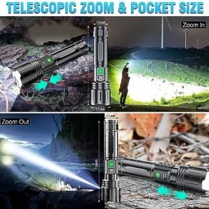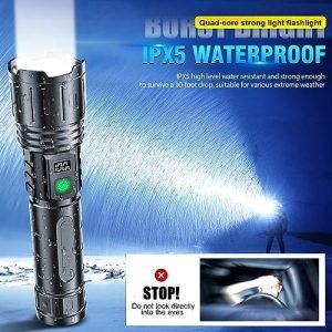Waterproof, Compact & anti-slip sturdy: High Lumen Tactical Flashlight with sturdy aluminum body makes IPX6 Waterproof for all weather use and has impact resistance. This powerful Rechargeable flashlight set included a 1pcs Led Rechargeable Flashlight, 1pcs usb type C cable, 1pcs user manual . 1pcs storage box . YOU WILL LIKE OUR HIGH LUMEN LONG BEAM LED FLASHLIGHT!