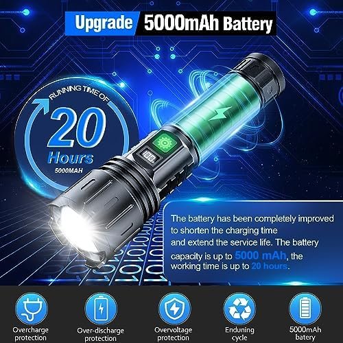 Long Runtime with 5000mah Ba-tt-ery: Hoxida Tactical Rechargeable flashlight could run up to 20Hours in Low Modes, never let you worry about the power off , This High Lumen rechargeable flashlight is widely used in outdoor survival activity, like camping, hiking, fishing, BBQ, dog walking or any outdoor activities.