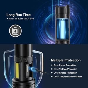 【15H RUNNTIME & 3H CHARGING】This rechargeable flashlights is equipped with a high-capacity rechargeable bāttery, providing up to 15 hours of continuous runtime on low mode.The runtime of this flash light depends on the selected mode setting. Additionally, it features a USB intelligent charging interface, allowing for 30% faster charging speed compared to regular led rechargeable flashlight