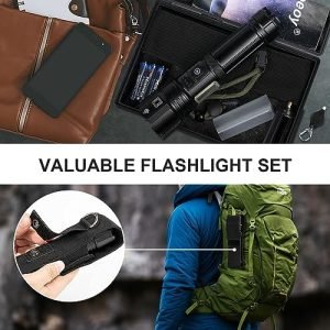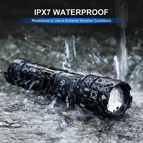 【IPX7 WATERPROOF & DROP PROTECTION】 Our waterproof flashlights feature advanced sealing technology that keeps them water-resistant, you can boldly navigate through rain, storms, and any challenging weather conditions.This high power flashlight is constructed from strong aluminum alloy, and it has undergone rigorous testing, able to withstand accidental drops of up to 23Ft