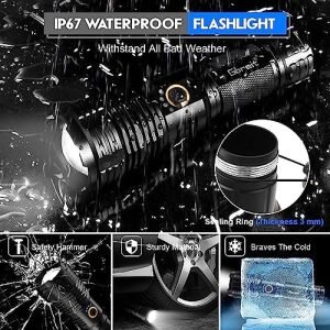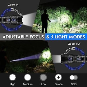 【ADJUSTABLE FOCUS & 5 LIGHT MODES】: The brightest flashlight has 5 modes: High/Medium/Low/Strobe/SOS. In any mode, we can press and hold the button for 3 seconds to turn off the led flashlights high lumens. According to we need, we can stretch the head of the high powered flashligh to change the focal length and beam size, freely choose long-distance observation and wide-range lighting. It is very suitable for camping, hiking, dog walking or any outdoor activities and emergency power-off backup.