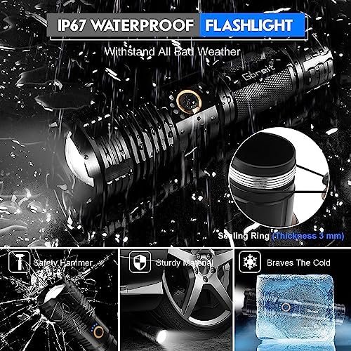 【IP67 WATERPROOF & PRACTICALLY INDESTRUCTIBLE】: Goreit G1915 IP67 waterproof flashlights is made of aviation grade aluminum alloy, which is durable and specially developed for rough handling and can withstands a 10-foot drop. This high powered flashlight has passed strict testing, including freezing, underwater submersion and running over with a full-sized truck, it still works! The handheld flashlights for emergencies is ideal for use in rain, snow, never fear of bad environments.