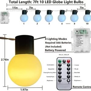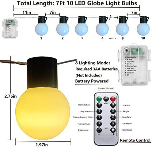 7Ft battery operated string lights with remote control, 10 warm white led globe lights. G50 led string light’s remote controlled include on/off, 8 lighting modes, dimmable and timer functions, you can select them to meet different decoration needs. Outdoor patio string light produces warm soft light at night, adding a romantic and magical colors to your life.