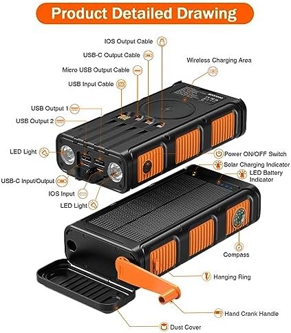 So does this solar power bank. It is equipped with so many functions for daily needs, such as huge capacity, wireless charging, built-in cables, multiple ports, 15W fast charging, solar panel charging, hand crank generator, flashlights, compass, carabiner, and so on. One power bank, with over ten functions for you to use.